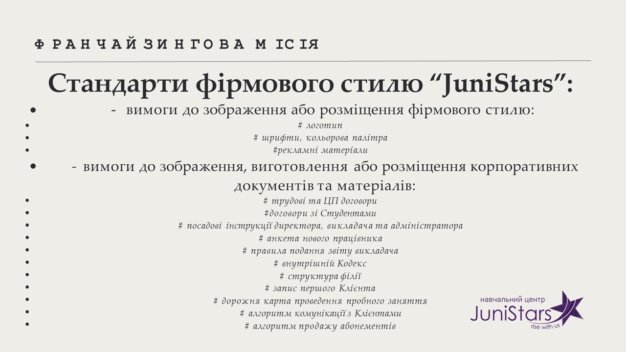 Тема її лекції “Особливості укладання франчайзингових договорів”. Презентація матеріалу відбувалася на прикладі власного досвіду становлення, розвитку бізнесу та його розширення шляхом продажу франшизи JuniStars.